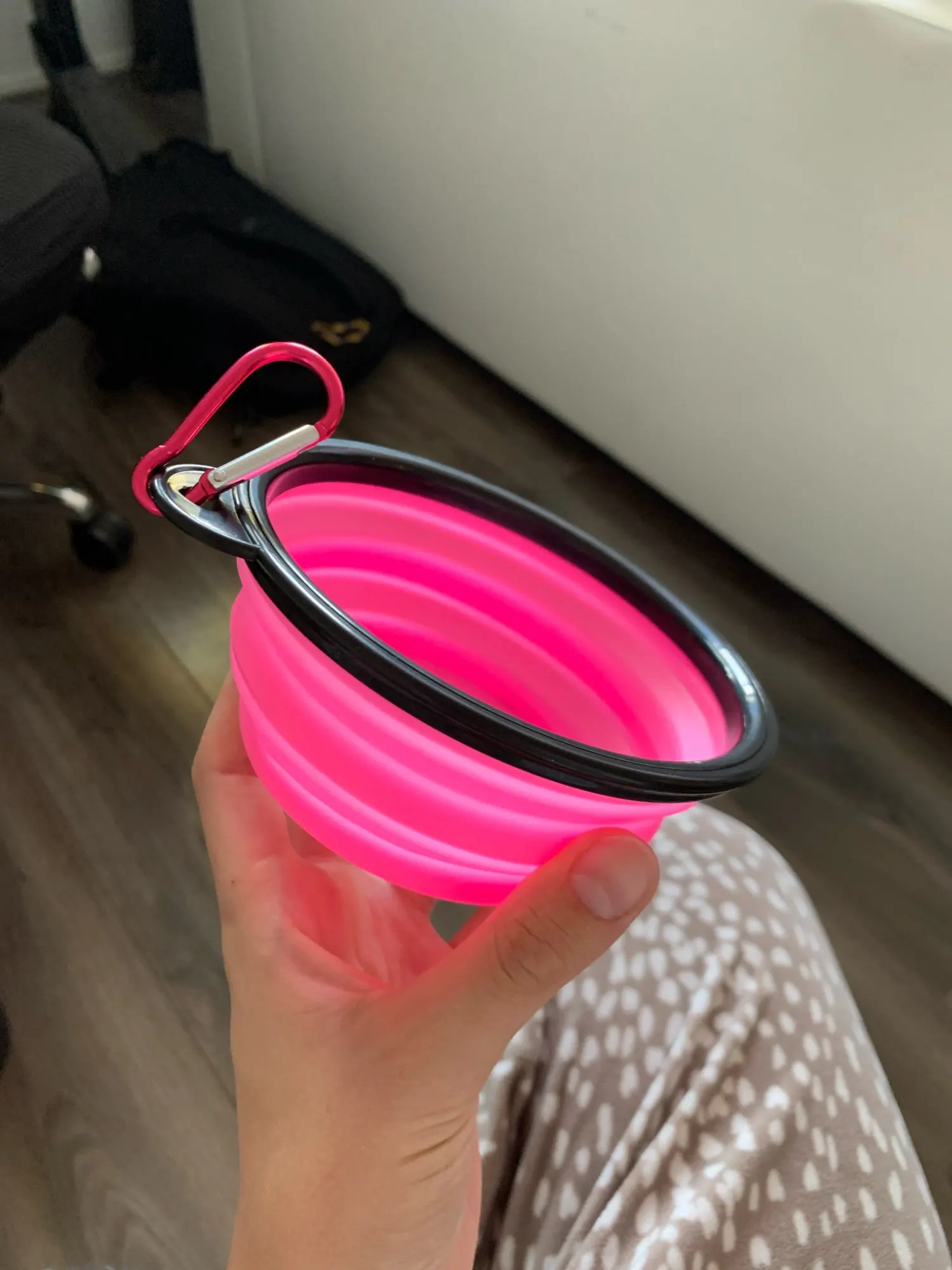 It’s bigger than expected but the material is really nice it is perfect even o go on walks with my dogs and they need water